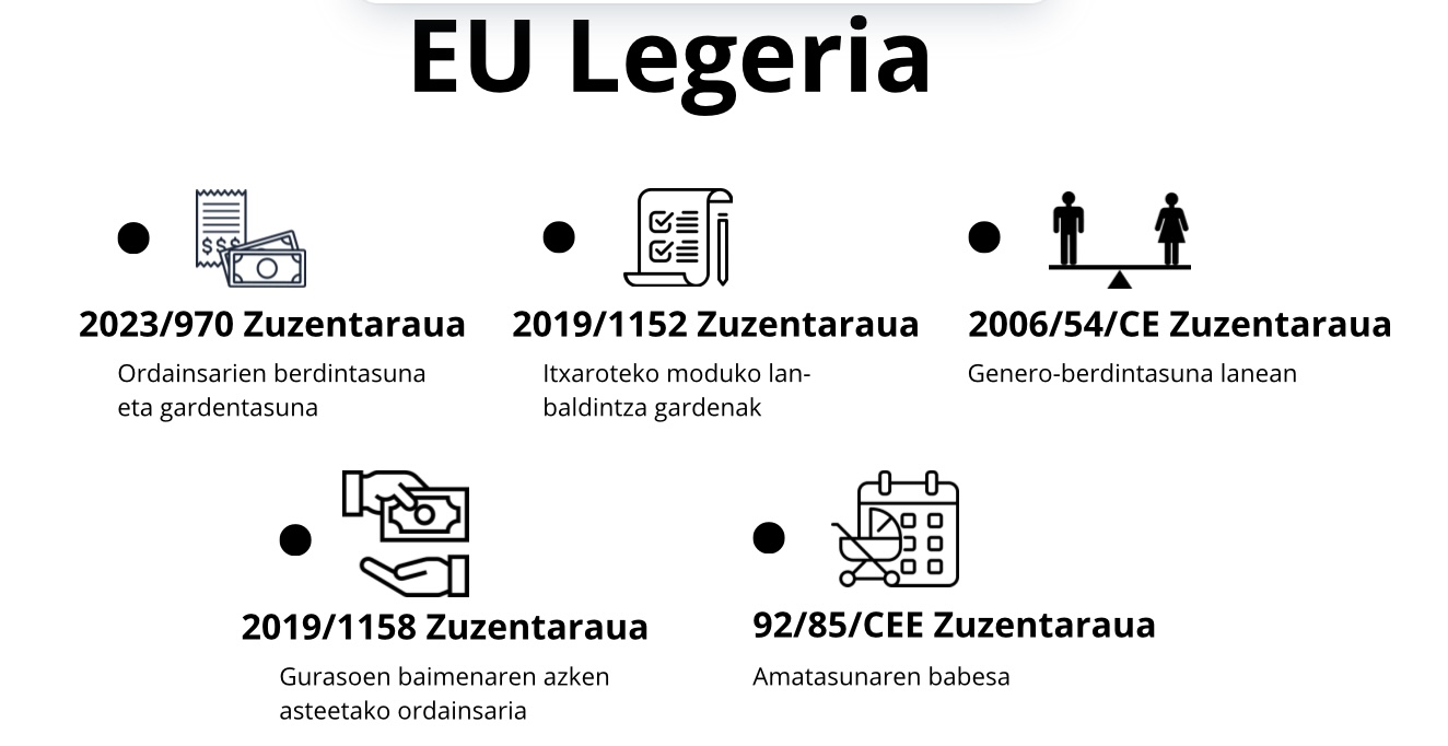 Oinarrizko araudi horrekin batera, Europar Batasunaren arau-esparruak beste zuzentarau batzuk ere baditu, kontziliazioan zentratutako zuzentarauak izan ez arren, zuzeneko eragina dutenak. Ordainsari berdintasunari eta soldata gardentasunari buruzko 2023/970 Zuzentarauaren helburua da EBn soldaten diskriminazioari aurre egitea eta generoko soldata-arrakala murriztea, azken hamarkadan % 13 inguruan mantendu baita. Bestalde, itxaroteko moduko lan baldintza gardenei buruzko 2019/1152 Zuzentarauak bermatu nahi du EBko langile guztiek, baita enplegu forma ez-konbentzionalak dituztenek ere, beren lan-baldintzak ezagutzea lan-harremana hasten denetik. Gutxieneko eskubideak ezartzen ditu, hala nola lantokiari, lan motari, lanaldiari eta ordainsariari buruzko informazioa. Azkenik, laneko genero-berdintasunari buruzko 2006/54/EE Zuzentarauak lan-eremuan gizonen eta emakumeen arteko tratu-berdintasunari buruzko Europako legeria finkatu eta eguneratzen du. Debekatu egiten du sexuan oinarritutako zuzeneko eta zeharkako diskriminazioa, enplegua lortzeari, lanbideko prestakuntzari, lanpostuz igotzeari eta lan-baldintzei dagokienez, besteak beste. Haurdunaldiarekin eta amatasunarekin lotutako diskriminazioa ere lantzen du, eta aukera eta tratu berdintasuna sustatzen du. Espainiak barne ordenamendu juridikoan txertatu ditu arau horiek guztiak, Langileen Estatutua, Enplegatu Publikoaren Oinarrizko Estatutua, Gizarte Segurantzaren Lege Orokorra eta lege mailako beste lege eta arau batzuk aldatuz.