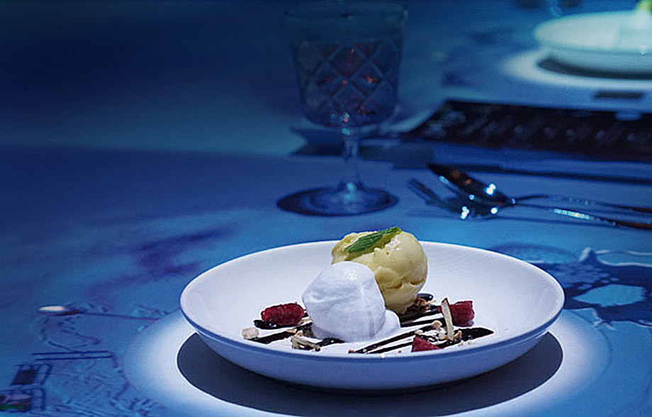 Mahaiaren gainean, animazioak proiektatzen dira eta jankideek, bere plater nagusia heldu arte, mahai-oihala plateraren azpitik igeri egiten duten arrain tropikalez betetako ozeano bihurtzen dela ikus dezakete. Edo, postrea baino lehen, platera elurtutako paisaia bihurtzen da; chefa iglu batetik ateratzen da eta plateraren gainera botatzen duen izozki-bola bat sortzen du, hori guztia soinuarekin batera.