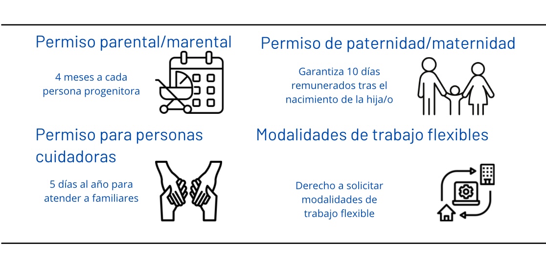 El sistema europeo, trata de garantizar una serie de permisos laborales destinados a fomentar la conciliación. El permiso de paternidad concede al menos 10 días laborables, remunerados como una baja por enfermedad, tras el nacimiento de los hijos o las hijas. El permiso parental/marental, reconoce un derecho individual a 4 meses por persona progenitora, de los cuales 2 son intransferibles, con el objetivo de equilibrar la implicación de ambas personas progenitoras. Asimismo, el permiso para personas cuidadoras permite disponer de al menos 5 días al año para atender a familiares con necesidades graves de atención. En cuanto a la flexibilidad laboral, las personas trabajadoras tienen derecho a solicitar modalidades de trabajo flexible, como el teletrabajo, la jornada reducida o los horarios flexibles, especialmente si tienen responsabilidades de cuidado. Finalmente, se prohíbe el despido o trato desfavorable relacionado con la solicitud o uso de estos permisos, y se exige a los Estados miembros poder garantizar una protección legal efectiva para todas las personas.