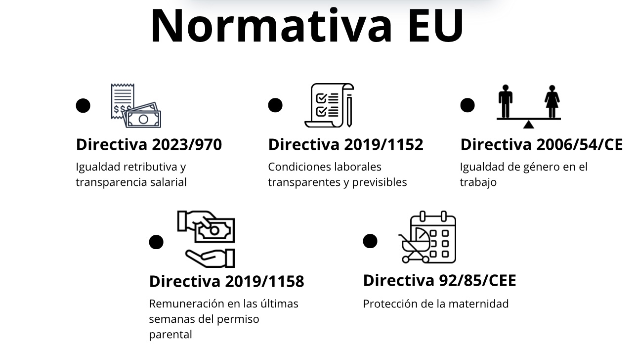 Junto con esta normativa básica, el marco normativo de la Unión Europea incluye otras Directivas que, pese a no ser propiamente Directivas centradas en la conciliación, tienen un impacto directo sobre la misma. La Directiva 2023/970 sobre igualdad retributiva y transparencia salarial tiene como objetivo combatir la discriminación salarial y reducir la brecha salarial de género en la UE, que se ha mantenido en torno al 13% durante la última década. Por su parte, la Directiva 2019/1152 sobre condiciones laborales transparentes y previsibles busca garantizar que todas las personas trabajadoras de la UE, incluidos aquellos con formas de empleo no convencionales, conozcan sus condiciones laborales desde el inicio de la relación laboral. Establece derechos mínimos, como la información sobre el lugar de trabajo, el tipo de trabajo, el tiempo de trabajo y la remuneración. Finalmente, la Directiva 2006/54/CE sobre igualdad de género en el trabajo consolida y actualiza la legislación europea en materia de igualdad de trato entre hombres y mujeres en el ámbito laboral. Prohíbe la discriminación directa e indirecta por razón de sexo en aspectos como el acceso al empleo, la formación profesional, la promoción y las condiciones laborales. También aborda la discriminación relacionada con el embarazo y la maternidad, y promueve la igualdad de oportunidades y el trato en el trabajo. España ha incorporado todas estas normas en su ordenamiento jurídico interno, mediante la modificación del Estatuto de los Trabajadores, el Estatuto Básico del Empleado Público, la Ley General de la Seguridad Social, así como otras leyes y normas con rango de ley.