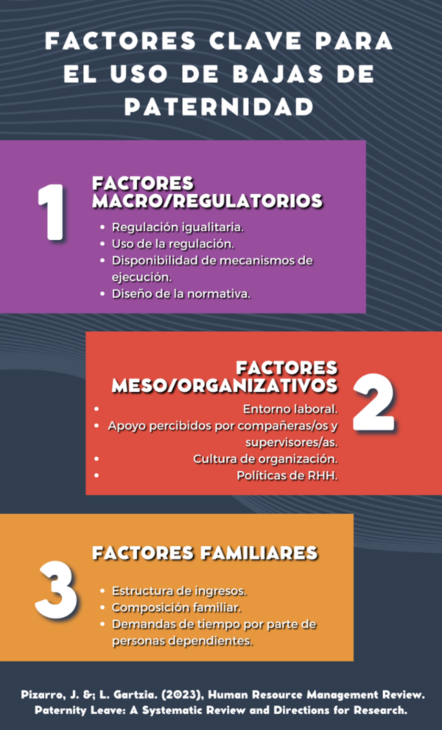 - Factores macro/regulatorios: se detecta como necesaria una regulación igualitaria con permisos de paternidad remunerados y específicamente dirigidos a ellos, mostrándose que entornos en los que se proporciona pocos incentivos a los hombres para que asuman sus responsabilidades en el cuidado contribuyen a la baja frecuencia con la que los padres se acogían a estos permisos. Por lo tanto, no, no es sólo una cuestión de intención.