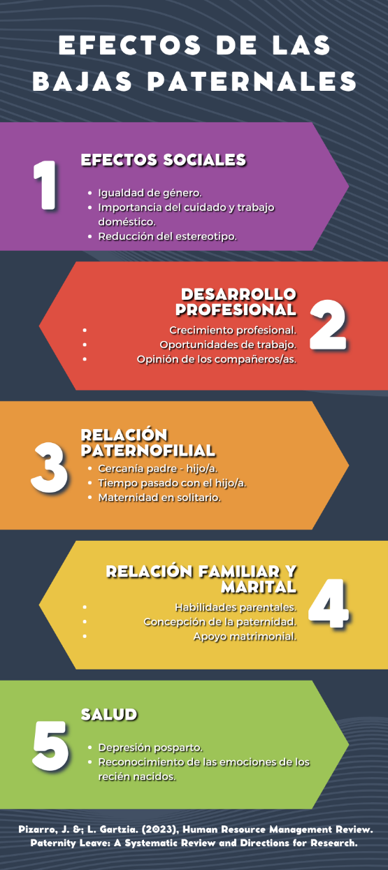 Según recientes investigaciones (Pizarro y Gartzia, 2023; https://doi.org/10.1016/j.hrmr.2023.101001), el uso de permisos de paternidad por parte de los hombres tiene múltiples beneficios tanto para las familias como para las empresas, incluyendo efectos positivos en la relación con sus hijas/os, mejoras en la salud individual y familiar, relaciones familiares y conyugales más positivas, o desarrollo de entornos laborales más igualitarios.