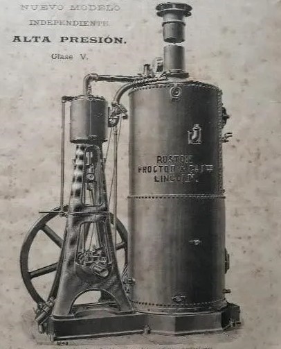Ruston, Proctor & Co. Ltd. había surgido en 1840 con la denominación Burton & Proctor, que cambió de razón social en 1857, cuando la parte del negocio de Theopilus Burton fue comprada por el empresario de maquinaria agrícola Joseph Ruston. En poco tiempo la empresa se convirtió en líder en la producción de locomotoras, ingenios para la industria y tractores para la agricultura, pero sobre todo destacaron en la fabricación de máquinas de vapor. En su catálogo de productos contaban con varios modelos, entre los que sobresalían el famoso “locomóvil” (ingenio con ruedas para facilitar su desplazamiento), las máquinas de vapor semi-fijas accionadas por calderas como la nuestra, y las máquinas de vapor verticales, similares a la que años después se acoplaría a nuestra pieza.