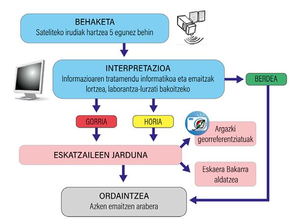 Eskaera Bakarrean aitortutako azalera guztien gainean hartzen diren sateliteen irudiak etengabe aztertzean datza, 5 egunean behin, nekazaritza-kanpaina osoan zehar.