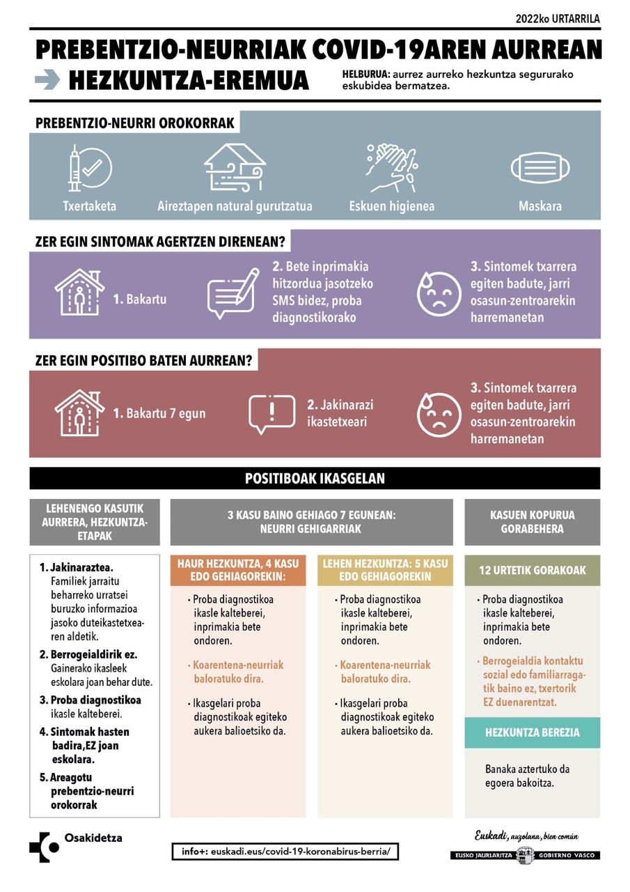 - Ikasgelara joan behar du, eta jarraitu prebentzio-neurriak betetzen (eskuak garbitzea, maskara erabiltzea, aireztapena, txertaketa…).