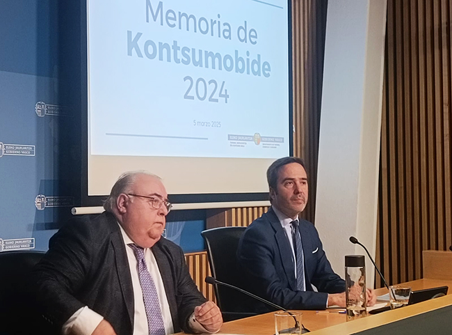 El Consejero de Turismo, Comercio y Consumo, Javier Hurtado, ha presentado hoy la memoria de balance de actividad de Kontsumobide en 2024 junto al director del Instituto Vasco de Consumo, Kontsumobide, Tontxu Rodríguez.