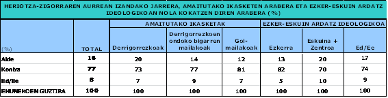 Inkestaren emaitzek adierazten dutenez, EAEko gazteen % 77 heriotza-zigorraren aurka daude. % 16k, ordea, alde daudela diote. % 7k ez dute iritzirik eman gaiari buruz.