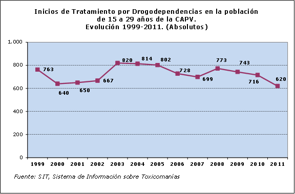 En 2011, 620 jóvenes iniciaron tratamiento por drogodependencias en la CAPV. En los últimos años el número de casos ha ido descendiendo y, concretamente, entre 2010 y 2011 este descenso ha sido del 13 %. El pico más alto de la última década se registró en 2003 con 820 casos y el más bajo en 2011.