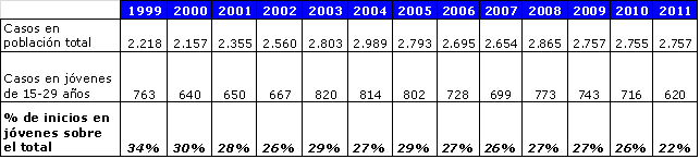 En 2011 dos de cada mil jóvenes de 15 a 29 años iniciaron un tratamiento por drogodependencias