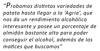 que se hacen en España y sólo conseguimos identificar dos, el resto prácticamente son iguales. Por eso buscamos algo diferenciador. La patata nos lo da porque es un producto meloso en boca, los alcoholes de grano son más recios, más secos en el paladar, y además tiene matices en nariz que recuerdan mucho al cacao ligeramente y al fruto seco. En boca es un producto que entra muy bien con recuerdos a hierba fresca, con un postgusto moderado, no muy prolongado. Es muy raro que la gente en general se inicie a beber vodka solo, pero éste, por las características que tiene, se bebe perfectamente solo. En combinado también es espectacular, con tónica, zumo de naranja, lima o zumo de tomate.
