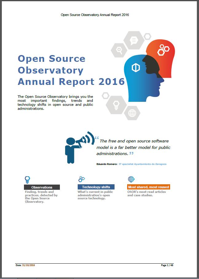 En la primera parte del informe "Open Source Observatory Annual Report 2016" se menciona y resume casos y ejemplos de Francia, Holanda, Reino Unido, España, Estonia, Malta, Italia, Bulgaria, Polonia o de la propia Unión Europea, y también se hace referencia al País Vasco (en concreto en la página 9 del informe).