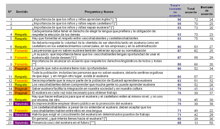 [***] Las respuestas posibles son: Desea que en el futuro se hable solo euskera; Desea que se hable en euskera y en castellano; Desea que se hable más que ahora en euskera. Desea que se hable en euskera y en castellano, como ahora; Desea que se hable en euskera y en castellano, menos que ahora en euskera; Desea que en el futuro se hable solo en castellano; Ns/Nc