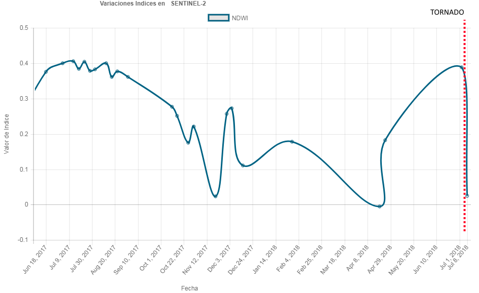 Geoeuskadi, a través de los Servicios Web de Teledetección, ya difunde el cálculo histórico de índices NDVI, NDWI o NBR, entre otros, con los que es posible ver el cambio brusco que se produjo en dicha fecha en términos de vegetación o humedad. El siguiente gráfico muestra la evolución desde el 12 de Febrero de 2017 hasta el 8 de Julio de 2018.