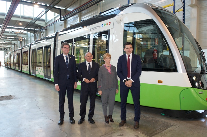 Euskotren, de la mano de la Consejera de Desarrollo Económico e Infraestructuras del Gobierno Vasco, Arantxa Tapia, ha presentado en los talleres de material móvil tranviario en Vitoria-Gasteiz la primera unidad de los nuevos tranvías “extralargos” que prestarán servicio en la capital alavesa. En el acto, la consejera ha estado acompañada por el diputado general de Álava, Ramiro González; el alcalde de Vitoria-Gasteiz, Gorka Urtaran; el director general de Euskotren, Imanol Leza; y Josu Imaz, director de Negocios y Tecnología del Grupo CAF.