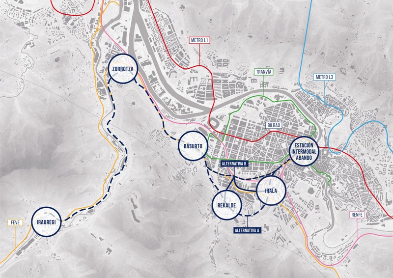 Una de las alternativas consiste en la utilización de la línea de FEVE conectándola mediante sistemas “people mover” (tipo funicular) con los centros de Rekalde e Irala. La otra opción plantea una variante de trazado de la citada línea con dos nuevas estaciones en los centros urbanos de Rekalde e Irala.