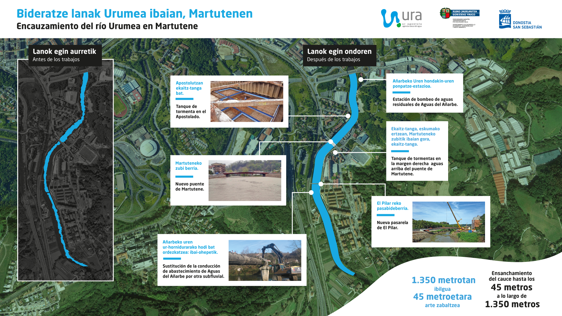 Dichas obras de la FASE II de defensa ante inundaciones del Urumea —entre el puente de Martutene y el del polígono 27— dan continuidad a las obras de ensanchamiento del cauce aguas arriba del puente de Martutene (FASE I), concluidas en 2018. Durante el 2020 se ha trabajado en el ensanchamiento del cauce de los 25 metros que presentaba antes, a los 45 metros de ancho actuales, a lo largo de 500 metros del tramo. Esa ampliación del cauce ha requerido la excavación y transporte de 120.000 m³ de tierra y piedra.