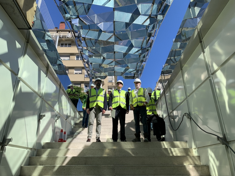 Arriola, junto al viceconsejero de Infraestructuras y Transportes, Pedro Marco, ha accedido esta mañana a la nueva estación por el cañón contiguo al polideportivo de Bentaberri que, desde hace ya dos semanas, cuenta también con la marquesina que lleva la firma del estudio noruego Snohetta. Esta se desarrolla en base a una estructura tridimensional marina, tipo coral y de acero inoxidable, revestida por ambas caras con finas láminas vítreas, retroiluminada por leds en horario nocturno.