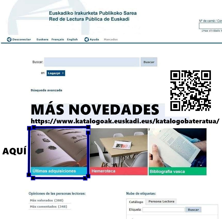 Otra forma de conocer las incorporaciones a la colección y de forma más inmediata es a través de la página web que aparece en la imagen. Se trata de la página web de la Red de Lectura Pública de Euskadi (RLPE) donde en el apartado "últimas adquisiciones" se pueden consultar los documentos recién llegados a la Biblioteca Municipal de Legazpi: www.liburutegiak.euskadi.eus/katalogobateratua.