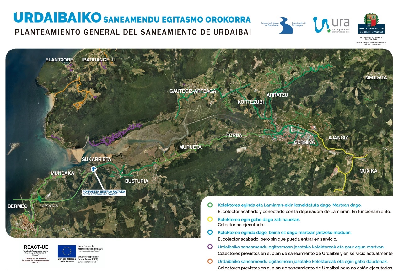 La Agencia Vasca del Agua-URA y el Gobierno Vasco han invertido 70 M€ en las obras de saneamiento de la comarca de Urdaibai. Las obras de mejora de saneamiento de Urdaibai buscan recoger la mayor parte de las aguas residuales de la comarca, y derivarlas a la depuradora de Lamiaran, en Bermeo, para su correcta depuración y posterior vertido al mar. Condición imprescindible para poder velar por el buen estado ecológico de las aguas de un espacio de gran valor ecosistémico.