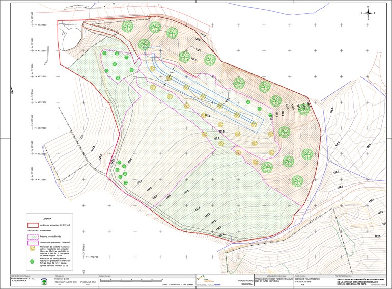 El área de intervención es de unas 2 Ha, de las cuales unos 8.500 m2 se dedicarán a trabajos en elementos vinculados a la antigua explotación minera y puesta en seguridad del conjunto (galería y escombreras mineras); y se acondicionará y recuperará unos 7.240 m2 para el rebrote de especies forestales. En concreto, se revegetarán las praderas con diferentes especies pratenses (ray-grass, festuca y trébol blanco), los taludes se integrarán paisajísticamente mediante plantaciones de arbolado autóctono (castaño y roble) compatible con las condiciones de puesta de seguridad.