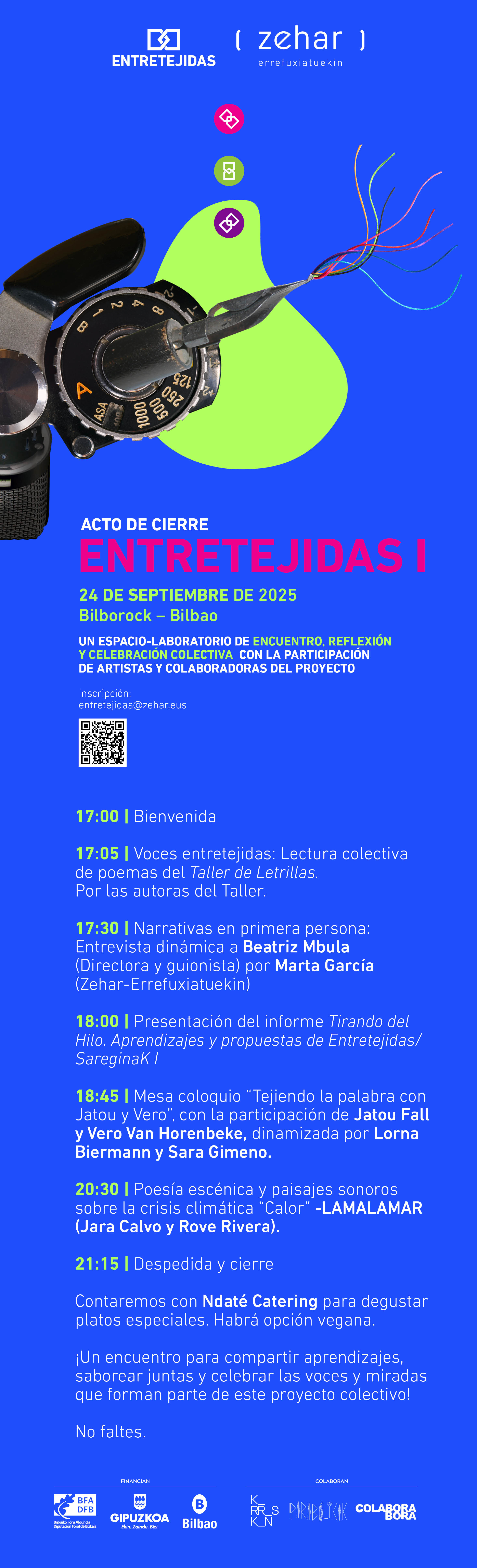 El próximo 24 de septiembre de 2025 tendrá lugar en Bilborock, Bilbao, el acto de cierre de Entretejidas I (JPG, 1 MB) , un espacio-laboratorio de encuentro, reflexión y celebración colectiva con la participación de artistas y colaboradoras del proyecto.