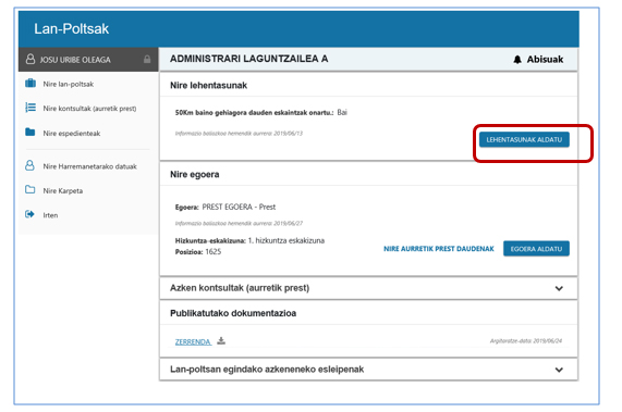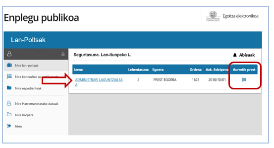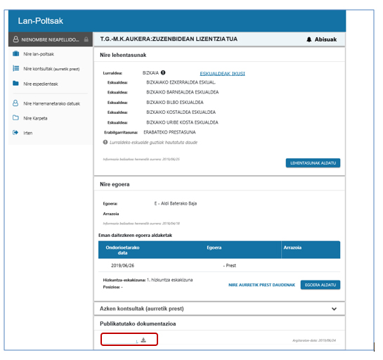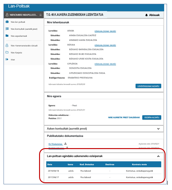 - Zure lan-poltsen datu eguneratuak zehatz-mehatz kontsultatu ahal izango dituzu (Administrazio Orokorrekoak, Justiziakoak eta Segurtasunekoak). Poltsa bakoitzean zein datu dauden ikusi ahal izango duzu, eta zure egungo egoerarekin bat ez badatoz, aldatu egin ahal izango dituzu.