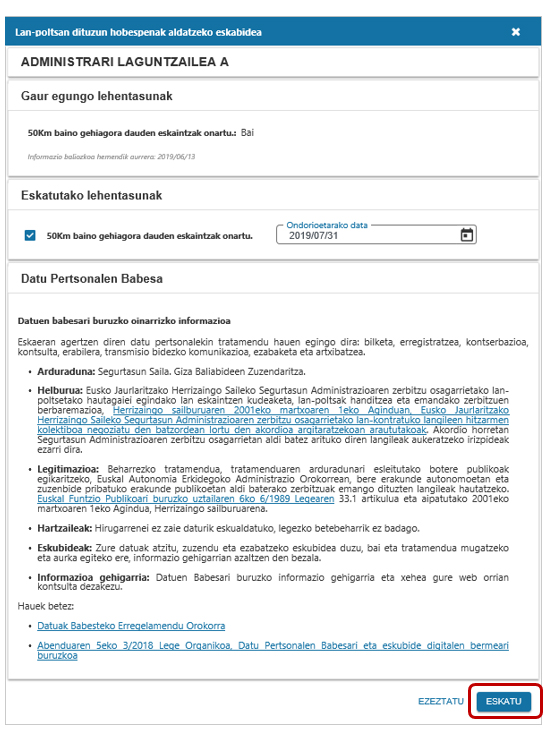 5.- Aldaketak egindakoan, eta datuen babesari buruzko klausulen ondoren, “Eskatu” sakatu behar duzu.