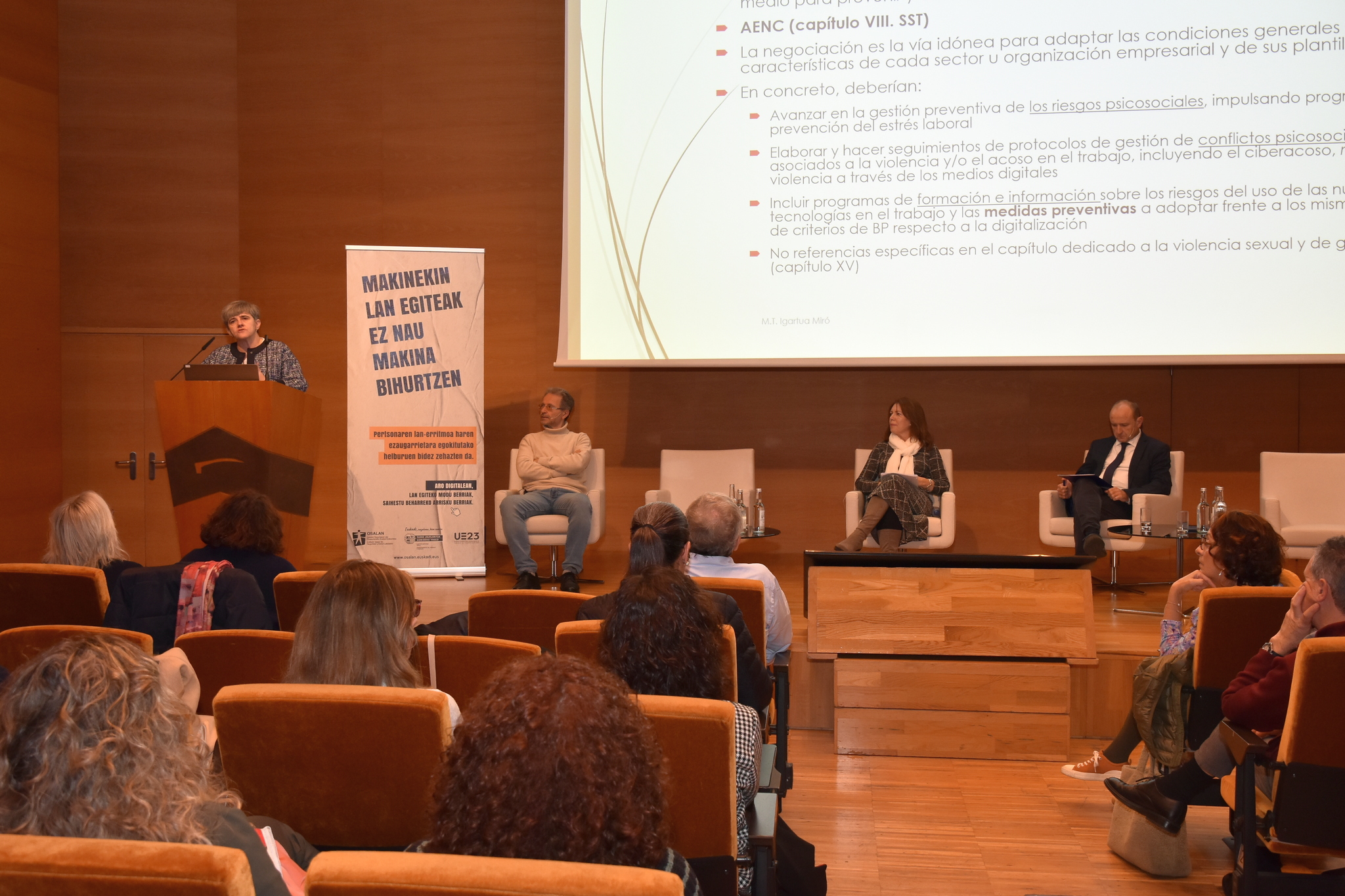 Eta, azkenik, laugarren mahai bat, Osalaneko psikosoziologiako taldeko prebentzio-teknikaria den Maite Gomezek moderatua, non, jardunaldi hauetan ohikoa den bezala, gizarte-eragileek parte hartu duten – Amaia López (Confebask), Inko Iriarte (LAB), Alfonso Rios (CCOO) eta Juan Carlos Cárdenas (UGT) –.
