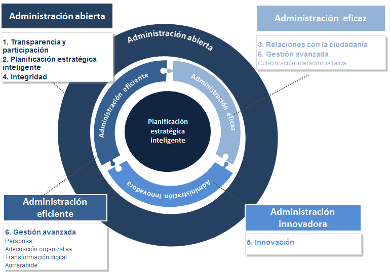 - Colaboración: un gobierno colaborativo implica y compromete a los ciudadanos y ciudadanas y demás agentes en el propio trabajo de la administración.