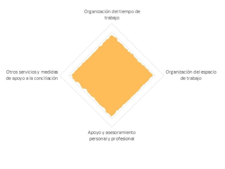 Si la imagen obtenida se acerca al gráfico mostrado en la parte de abajo, tu empresa está SENSIBILIZADA en las políticas de conciliación. Habéis dado algunos pasos, pero aún existen dimensiones en los que debéis implementar medidas que ayuden a lograr el objetivo. Seguir en ese camino de mejora continua que ya habéis iniciado. |