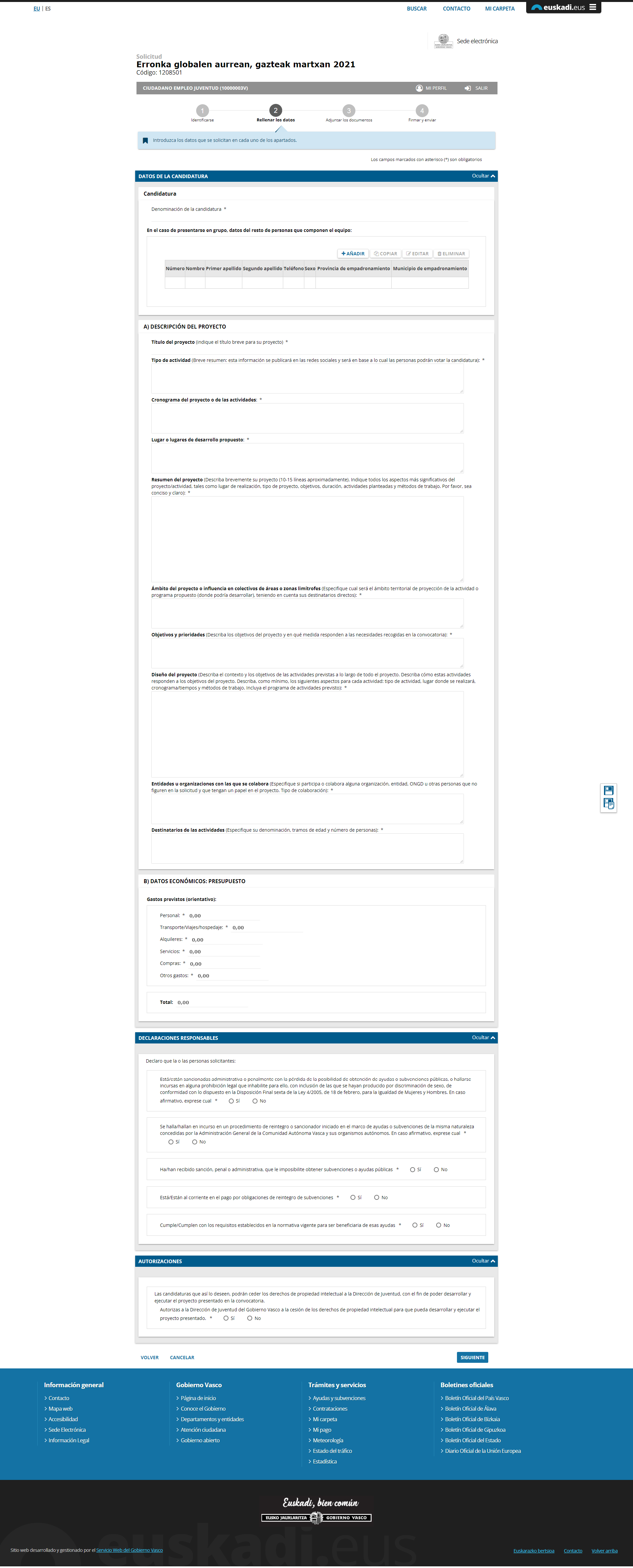 - Una declaración responsable en la que deberá hacerse constar el cumplimiento de los requisitos de las letras c), d) y e) del párrafo segundo de la Base Tercera, y que se encuentra incluido en el modelo de solicitud que figura en el Anexo II de la orden de convocatoria y que se encuentra disponible en Gazteaukera, en la página web de la Agencia Vasca de Cooperación para el Desarrollo y en la sede electrónica de la Administración Pública de la Comunidad Autónoma de Euskadi https://www.euskadi.eus/servicios/1208501