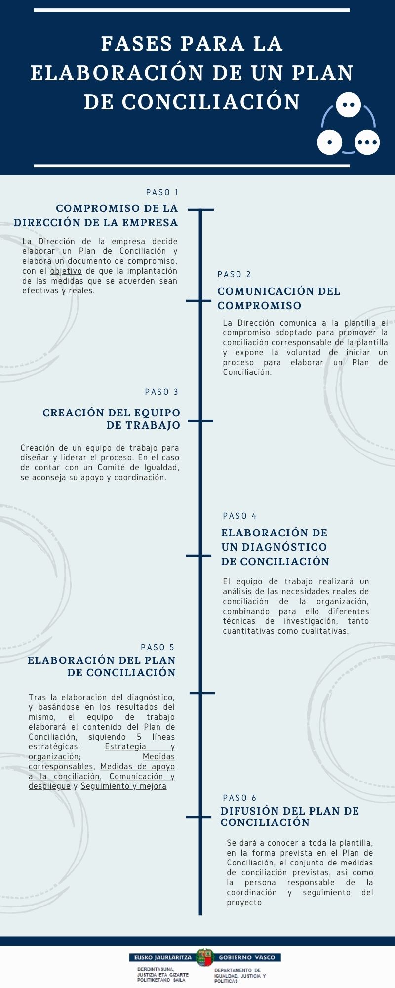 Observación: el Plan de Conciliación debe elaborarse con perspectiva de género. Así, tanto el proceso como el propio Plan se realizará para todas las personas trabajadoras, con el objetivo de promover una conciliación corresponsable. Es por esa razón que las organizaciones que ya cuenten con un Plan para la Igualdad partirán de una sensibilización y una reflexión previa sobre la conciliación, por lo que este proceso les resultará más ágil que a aquellas que no dispongan de uno.