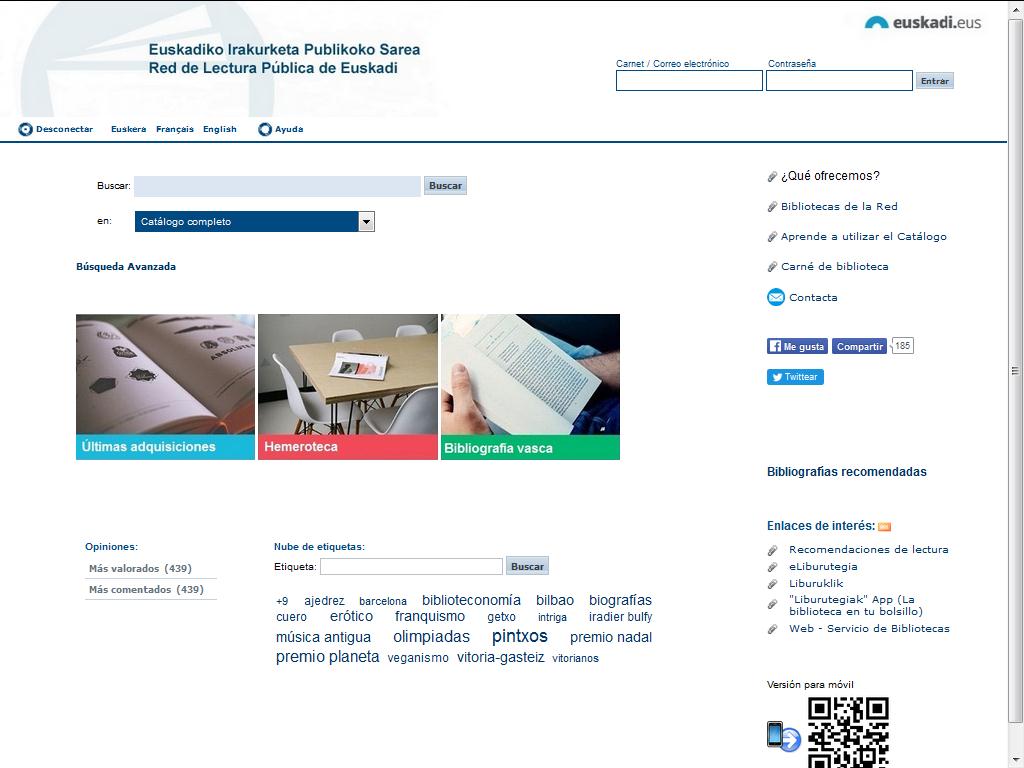 Se trata de una base de datos que recoge la información disponible en todas las bibliotecas municipales de Euskadi que participan en la Red. Este catálogo en línea (también llamado OPAC) permite la consulta bilingüe de los fondos de todas las bibliotecas participantes y facilita la localización y el acceso de los materiales bien sean libros, o películas, música, etc. Podrás conocer no sólo en qué biblioteca se encuentran los documentos, sino también si son prestables, si están prestados a algún/a lector/lectora y cuándo han de devolverse. Tiene la ventaja añadida de que puede ser consultado desde cualquier ordenador o dispositivo conectado a Internet.