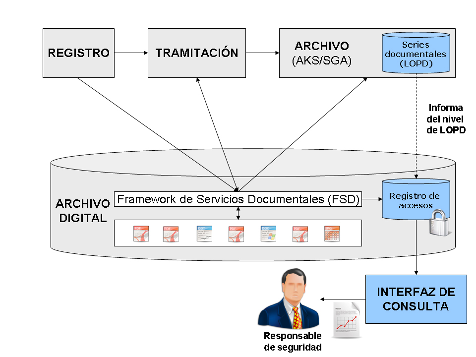 Cuando un sistema de información del Gobierno vasco -por ejemplo, la aplicación de Registro, cualquier aplicación de Tramitación, el propio Sistema de Gestión de Archivo (AKS/SGA) o cualquier otro sistema de gestión- accede a un documento albergado en el Archivo digital o deposita uno nuevo, lo debe hacer invocando un servicio web del Framework de Servicios Documentales (FSD). Éste, comprueba los permisos de acceso del sistema de información y decide si atender o no la petición. En cualquiera de los dos casos, si el documento solicitado está calificado, según criterios de LOPD, como de nivel alto se apunta una nueva entrada en el Registro de accesos, con los siguientes datos:- Identificación del usuario que ha realizado el acceso.