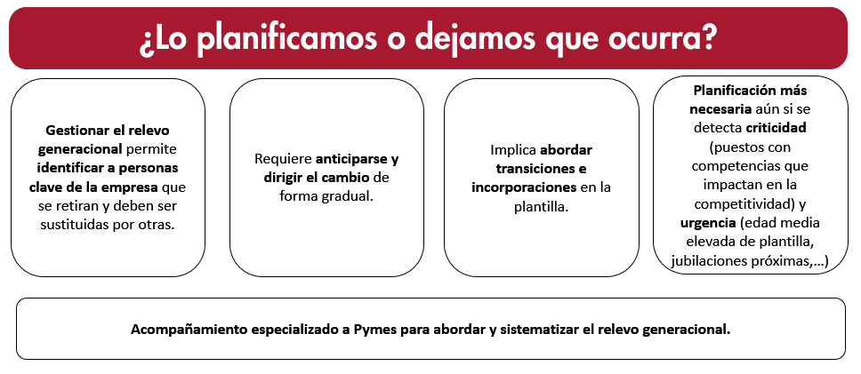 Un servicio de acompañamiento especializado y gratuito para pymes preocupadas por cómo abordar con éxito el relevo generacional en sus plantillas o, más concretamente, en determinados puestos críticos para su negocio, de forma que el conocimiento se transfiera de forma adecuada y permanezca en la compañía.
