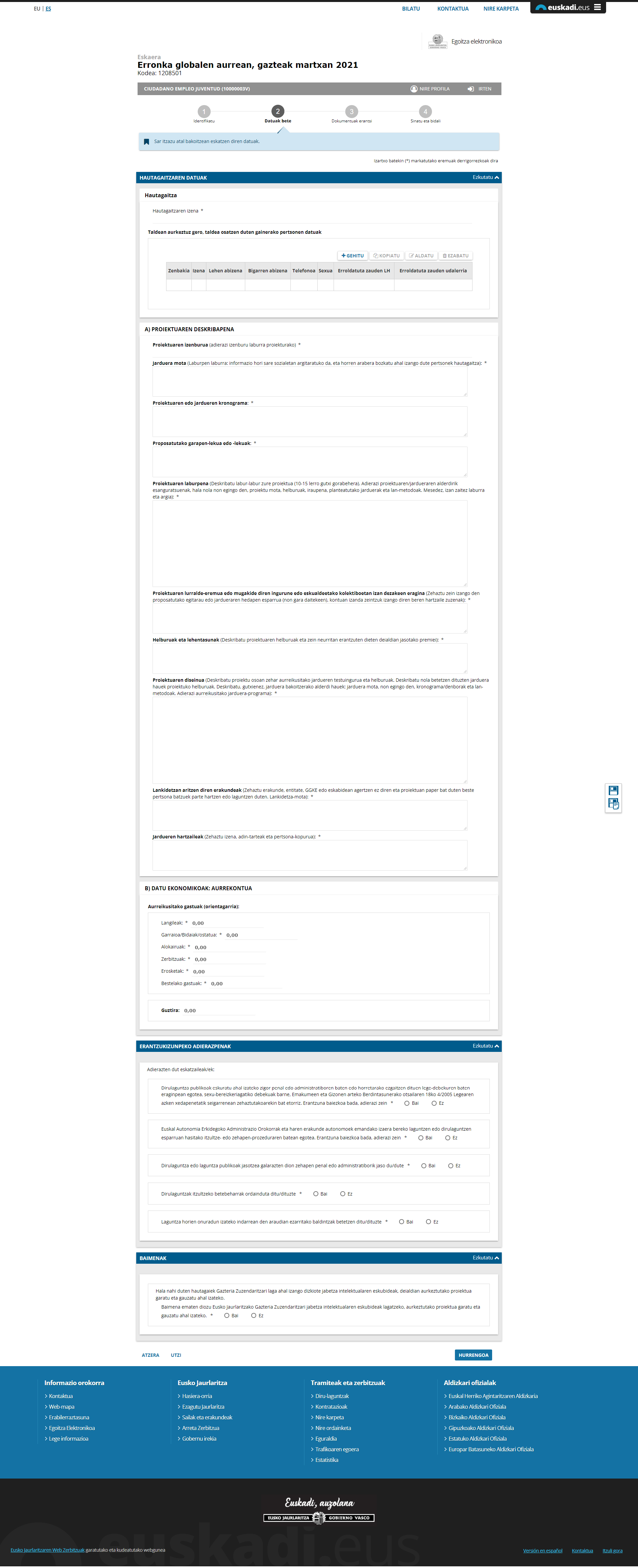 1. – Pertsona hautagaiek bete beharreko eskabide-eredua deialdiaren aginduaren II. eranskinean dago, eta Gazteaukeran, eLankidetzaren webgunean eta Euskal Autonomia Erkidegoko Administrazio Publikoaren egoitza elektronikoan egongo da eskuragarri: https://www.euskadi.eus/zerbitzuak/1208501
