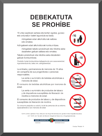 - 2. En los establecimientos de hostelería en los que en virtud del presente decreto se deban colocar varios carteles se podrá colocar el cartel (modelo 14) con el siguiente texto: “SE PROHÍBE/La entrada y permanencia de menores de 16 años sin compañía de sus progenitores o personas responsables/La venta o suministro de bebidas alcohólicas a menores de edad/El consumo de bebidas alcohólicas por menores de edad /La venta o suministro de productos de tabaco y de dispositivos susceptibles de liberación de nicotina a menores de edad/El consumo de productos de tabaco y de dispositivos susceptibles de liberación de nicotina/Su consumo perjudica su salud y la de las personas de su entorno, especialmente si son menores de edad”.