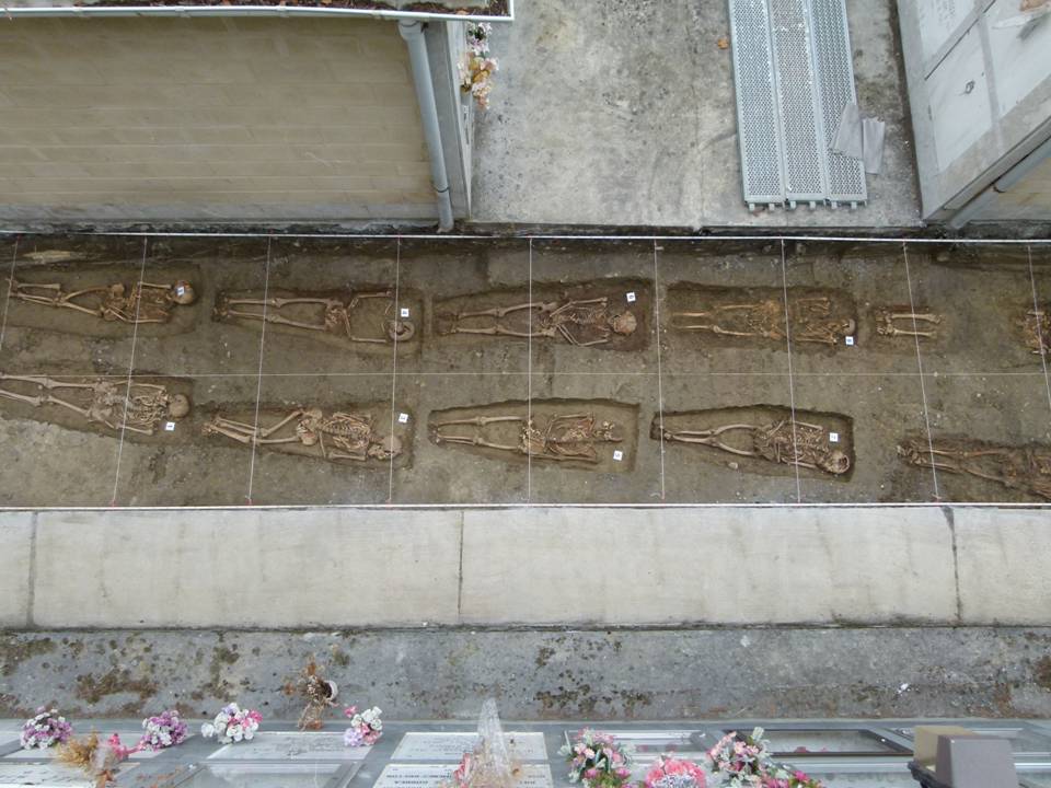 Hilobiak banakakoak ziren. Denak zeuden pinu-egurrezko hilkutxatan ehortzita, barrualdean, ahoz gorako etzanera, besoak toraxaren eta abdominaletako zuloaren gainean tolestuta. Beheko gorputz-adarrak paraleloan luzatuta, kasu batean izan ezik (3. pertsona): azken horrek gorputz-adarrak tolestuta zituen, ziur aski zuzen egoteko lekurik ez zegoelako.