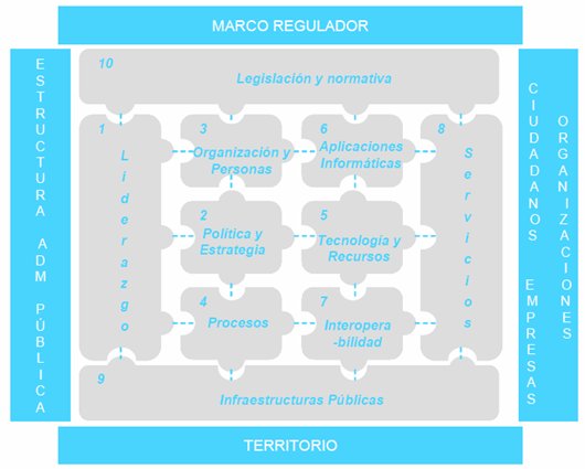 Sintetizan los diez referentes base para la evaluación de la administración en el ámbito de lo electrónico (en gris en el esquema).