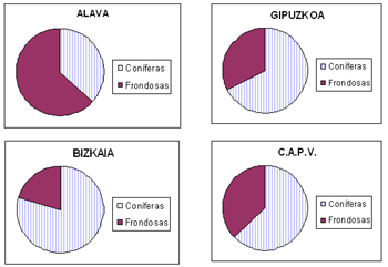 Con estas cifras, la CAPV pasa a ser la Comunidad Autónoma con mayor cantidad relativa de madera en pie, es decir, con mayores existencias medias por hectárea arbolada, superando a Navarra (118 m3/ha). Alava es el Territorio que presenta unas menores existencias absolutas y relativas, y es también el único que presenta una primacía de las frondosas.
