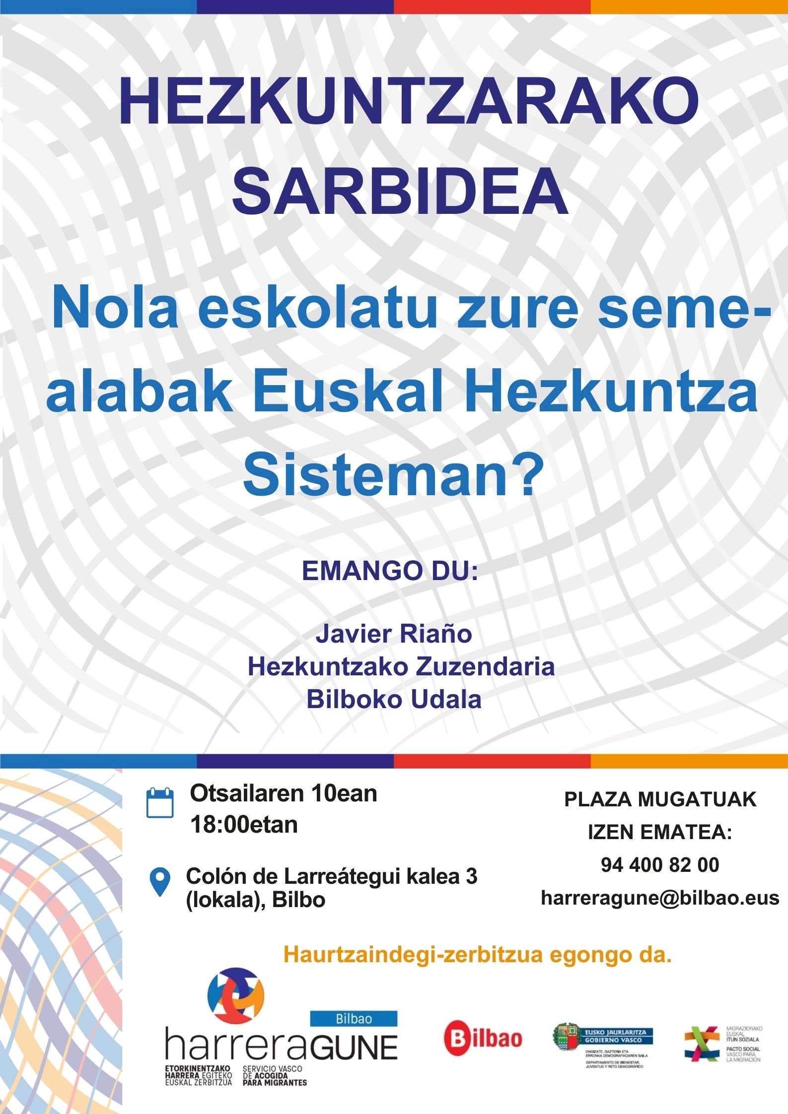 Harreragunetik heziketarako sarbideari buruzko informazio-saio batera gonbidatu nahi zaituztegu. Saioa bereziki zuzenduta dago hemen berriki iritsitako familiei eta, oro har, Euskal Hezkuntza Sistemaren barruan nola egin seme-alaben eskolatzea hobeto ezagutu nahi duten pertsona guztiei.