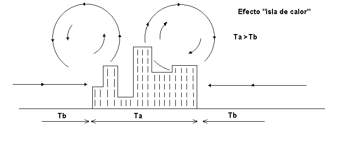 Este conjunto de modificaciones supone la aparición de lo que se conoce como "isla de calor" que es capaz de generar de manera propia una circulación convectiva caracterizada por vientos débiles que penetran en el interior de la ciudad y son capaces de modificar el régimen pluviométrico medio de la región en la que se sitúa la ciudad.