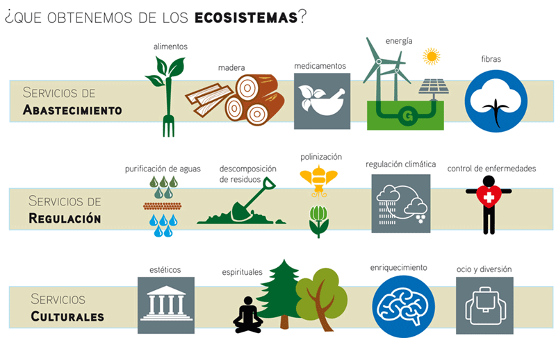 Estos servicios se clasifican en tres grupos: i) de abastecimiento o producción (como los alimentos, agua, energía), ii) regulación (como el control del clima, depuración del agua, polinización), y iii) culturales (educación, estética).