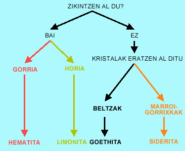 Metodo erraz bat hemengo meategietatik ateratako burdin mineral guztiak bereizteko azpiko klabean ikusten den bezala: