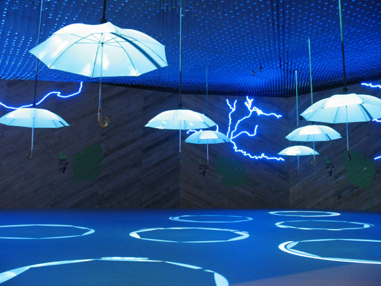 Sabaiak uraren errepresentazio bat erakutsiko du euria eta itsasoa irudikatuz metakrilatoaren bidez. Eta led-ek zeru-sabai bat erreproduzituko dute. Hormetan, egurrezko panelen gainean zizelkatuta, Euskadiko ibilgu eta arro nagusiak agertuko dira. Bisitariak sabaietik zintzilik dauden aterkiak mugitzen dituenean aterkietako ohialean, pantaila bat balitz bezala, gizartearen eta gizarteak uraren zikloarekin duen harremanari buruzko irudiak proiektatuko dira eta bisitaria inguratuko dute.