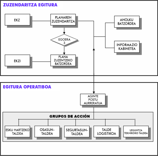 Plana aktibatzea ekarriko duen egoera larri guztietan, Kanpoko Larrialdi Plana zuzentzea eta koordinatzea Herrizaingo sailburuari baino ez dagokio, Larrialdiak kudeatzeko Legearen 21. artikuluan xedatutakoari kalterik egin gabe.