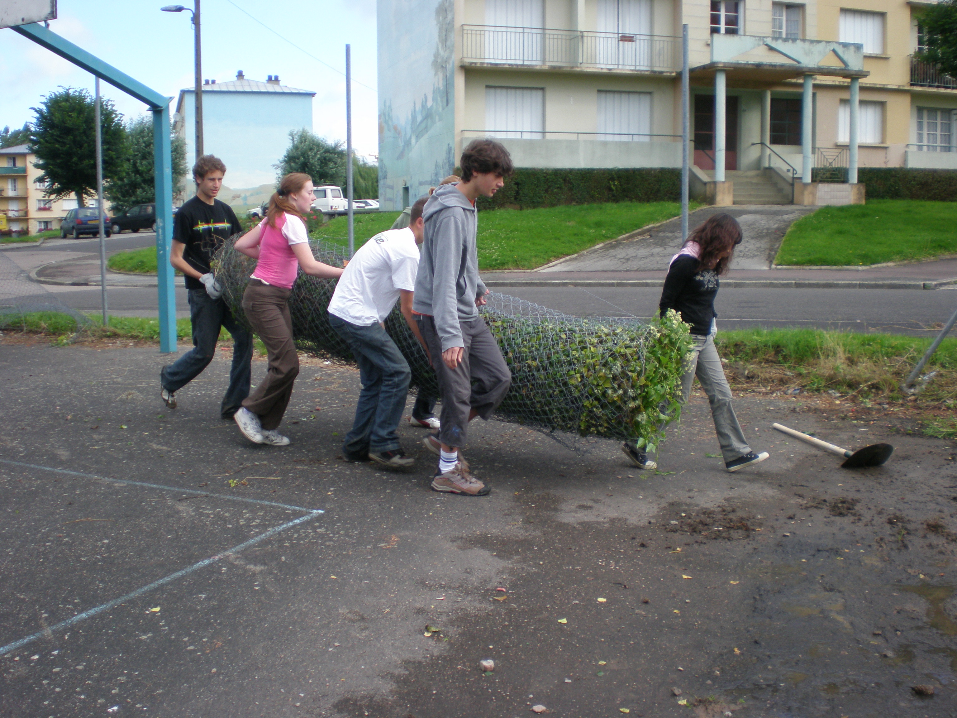Gure lana saskibaloi eta futbol zelaia berritzea izan zen: alambrada zaharra kendu eta berria jarri, ateak, saskiak eta lurreko marrak margotu... Proiektua garaiz bukatzeko talde lana ezinbestekoa izan zen.