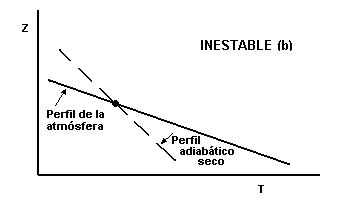 Consideremos las figuras : las líneas sólidas representan el perfil real de temperatura en la atmósfera y las lineas de trazos el de la temperatura que seguiría en sus desplazamientos verticales una burbuja situada previamente en A (perfil adiabático seco).