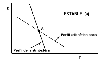 Begiratu irudiei: lerro lodiek atmosferaren tenperaturaren profil erreala adierazten dute, eta lerro etenak, lehen A puntuan (profil adiabatiko lehorrean) egongo litzatekeen burbuila batek bertikalki mugitutakoan jarraituko lukeen profila.