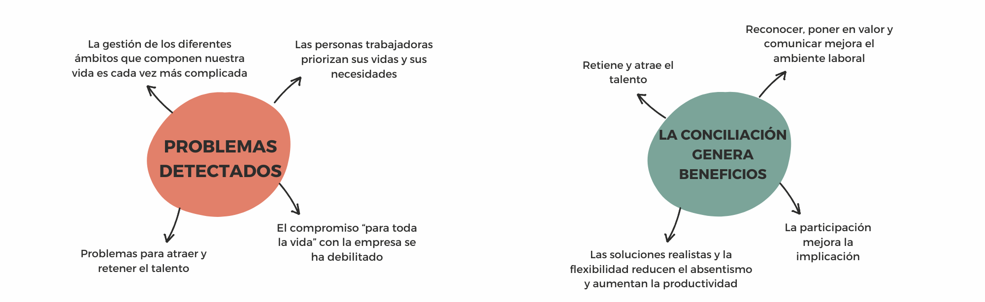 Los problemas de conciliación de la vida personal y familiar afectan negativamente a las empresas, ya que se traducen habitualmente en problemas de salud de las personas trabajadoras (desmotivación, absentismo, fuga de talento, etc.) repercutiendo, así, directamente en la organización. Pero si se implementa la conciliación de una manera adecuada, acarrea beneficios para la organización.